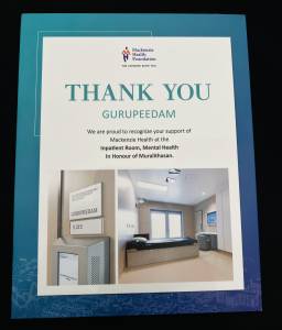 In alignment with its mission to uplift individuals emotionally, spiritually, and physically, Gurupeedam made a charitable contribution to Mackenzie Health, a major hospital network in York Region. This gift supported the creation of a multi-faith prayer room and a private inpatient room in the Mental Health Unit at Cortellucci Vaughan Hospital. These hospital-based improvements ensure that patients and families from all walks of life have access to compassionate, culturally inclusive care during moments of personal crisis.
